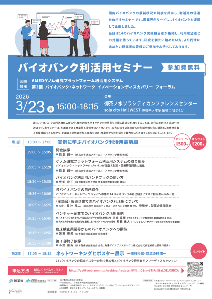 「バイオバンク利活用セミナー(合同開催:第3回 バイオバンク・ネットワーク イノベーションディスカバリー フォーラム)」を開催します(2026年3月23日)